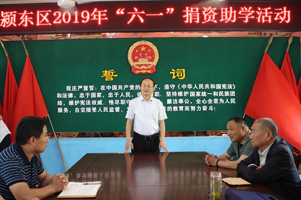 5月31日上午,在六一儿童节来领之际,颍东区人大常委会主任王雷到插花镇第一学区中心学校开展捐资助学活动。关工委副主任武治田、插花镇党委书记杨海陪同。